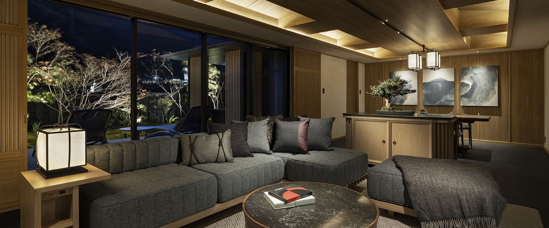 インテリアデザインにおいては、この地ならではの建築技法である白川郷の合掌造りを現代的に再構築し、意匠天井や建具等の随所のディテールを取り入れ、郷土の情緒を新たに継承した上質なスイートルームへと刷新させました。